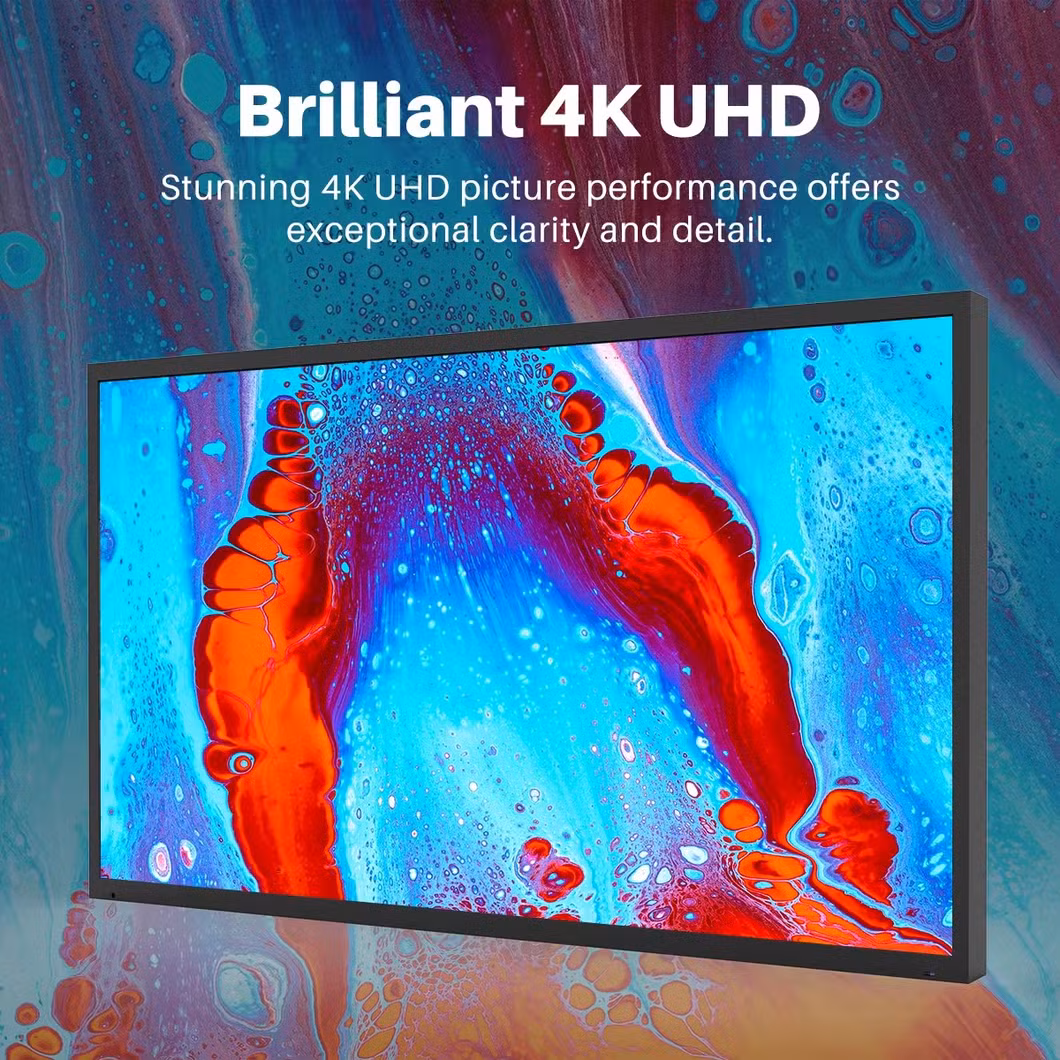 2.Ultra 4K HDR Display lo Smart TV per esterni è dotato di risoluzione 3840*2160 (4K), luminosità 700 nit e gamma di colori ultra-ampia di livelli e dettagli delle immagini creano una qualità delle immagini straordinaria, dettagli più evidenti e un senso di gerarchia più forte, permettendoti di immergerti in un'esperienza visiva meravigliosa.