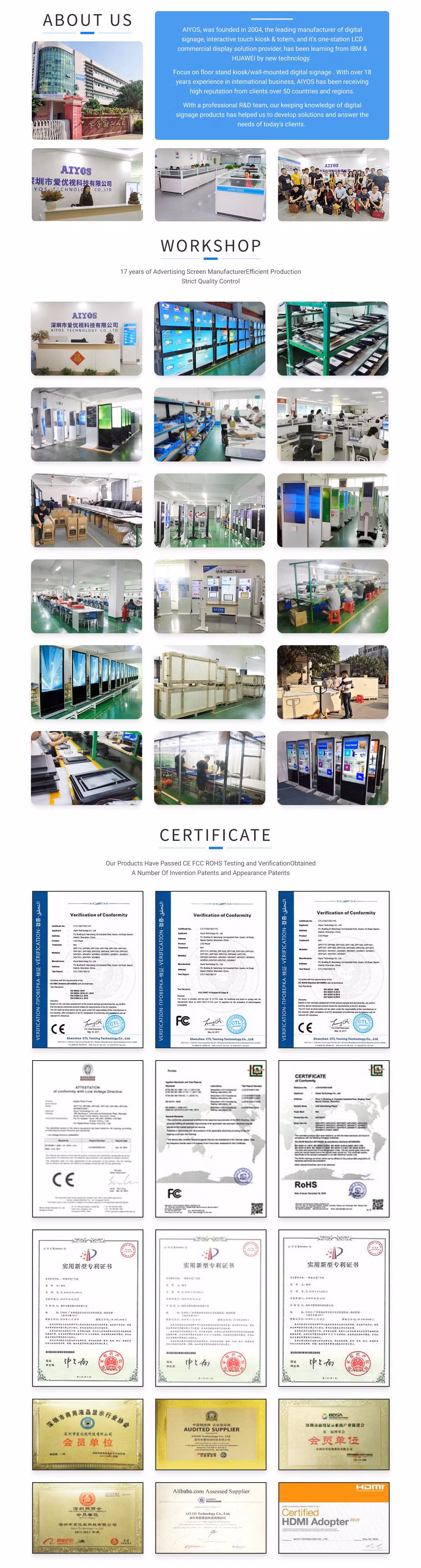 Gamma di prodotti AIYOS che copre: Chioschi indipendenti, display pubblicitari con montaggio a parete, cartellonistica digitale, tablet POS, cornice fotografica digitale, ecc.